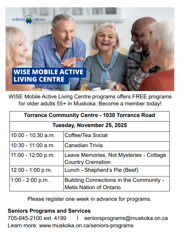 Torrance Community Centre - 1030 Torrance Road Tuesday, November 25, 2025 10:00 - 10:30 a.m. Coffee/Tea Social 10:30 - 11:00 a.m. Canadian Trivia 11:00 - 12:00 p.m. Leave Memories, Not Mysteries - Cottage Country Cremation 12:00 - 1:00 p.m. Lunch - Shepherd’s Pie (Beef) 1:00 - 2:00 p.m. Building Connections in the Community - Metis Nation of Ontario